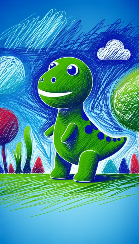 Nella Valle dei Gessetti Colorati, dove il cielo era un meraviglioso scarabocchio di linee blu e azzurre e l’erba un soffice tappeto di tratti verdi, viveva un piccolo dinosauro di nome Scribblino.